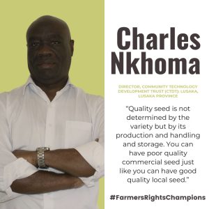 Charles soon found himself escorting international germplasm collectors across Zambia, making intimate ties with farmers and learning critical lessons about seed diversity. He pursued further education, earning a Masters Degree in Conservation and Utilisation of Plant Genetic Resources in the United Kingdom alongside Godfrey Mwila. When they returned, they founded Zambia’s national genebank and eventually contributed their expertise to the SADC genebank. Following a spell at WWF, Charles founded the Community Technology Development Trust (CTDT) to bridge the gap between farmers and genetic resource preservation efforts. His objective was to get farmers involved in genetic resource protection. CTDT now works directly with farmers to enhance their livelihoods by leveraging the diversity of locally accessible food plants.